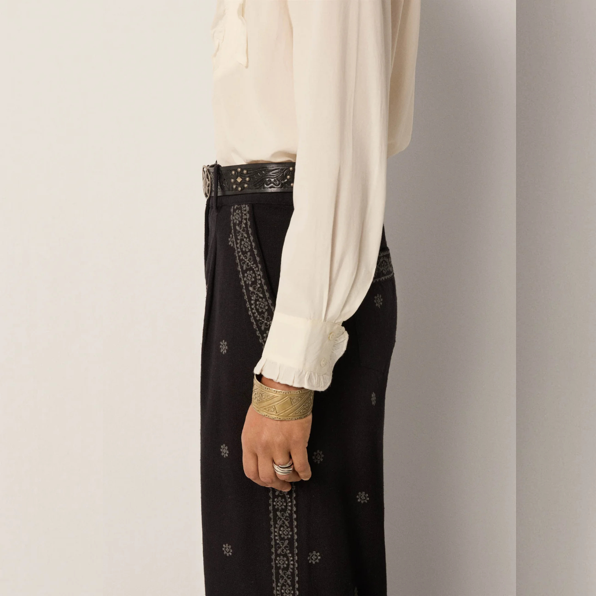 Porté ici avec la chemise Clara Pearl et sous le gilet Tequila Lupita, il revisite avec élégance et simplicité le style classique. La ceinture Pancho apporte une touche d'authenticité à ce look.