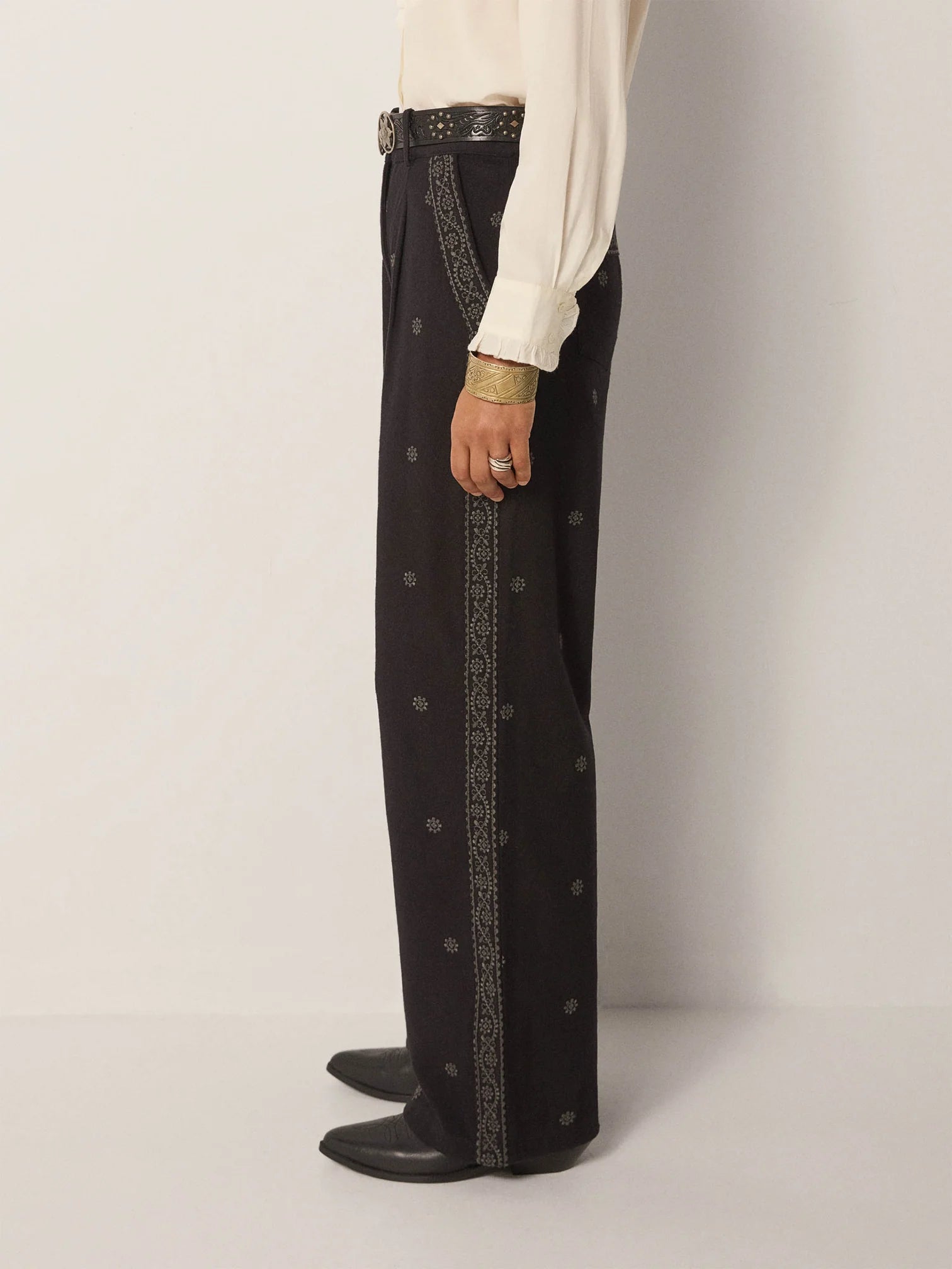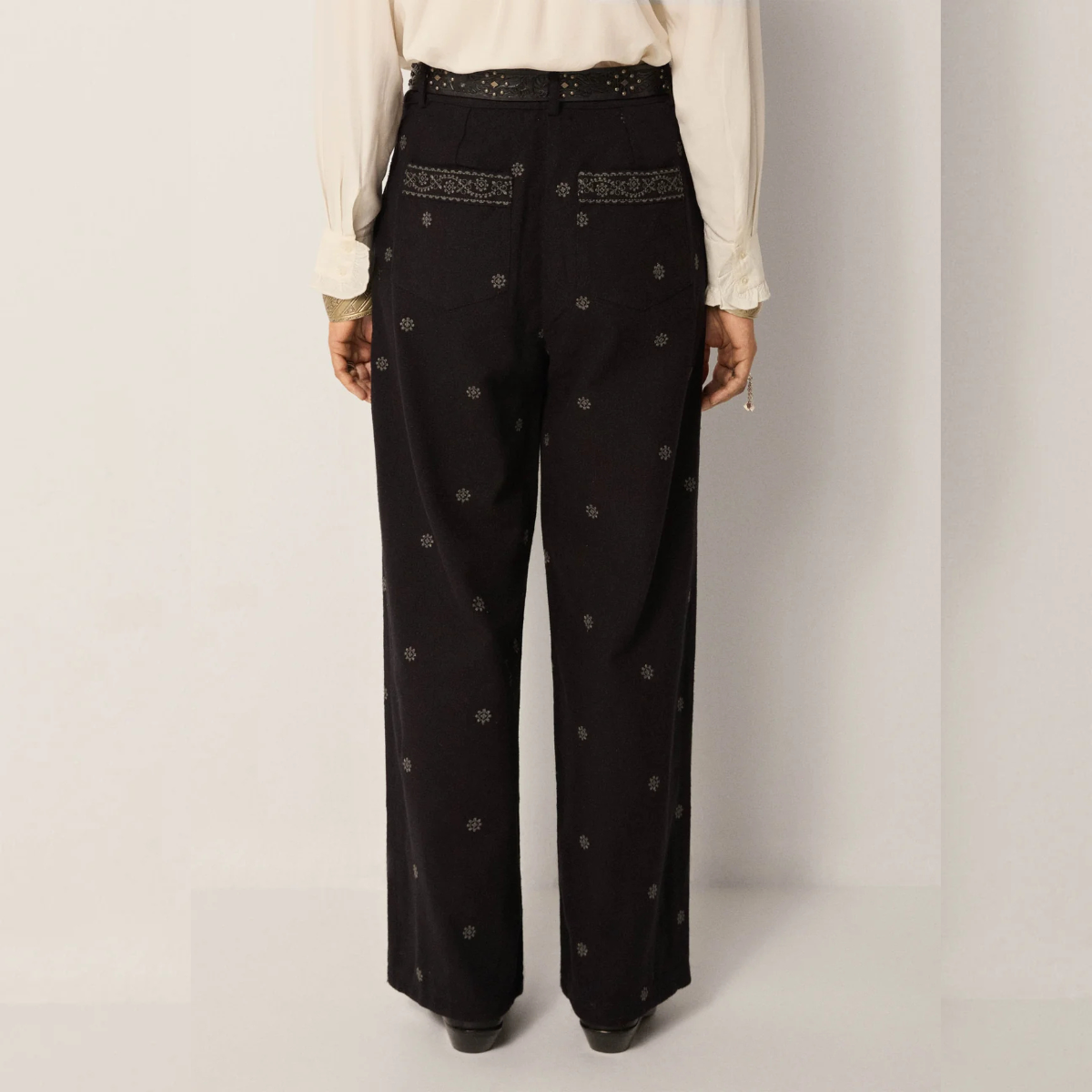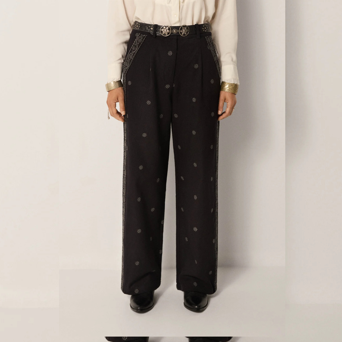 Confectionné en coton doux et épais tissé à la main, le pantalon Diego arbore une base noire profonde, parsemée de subtils motifs floraux gris et ornée d'empiècements latéraux brodés ton sur ton. Sa coupe droite épouse la silhouette avec fluidité, alliant raffinement et aisance.