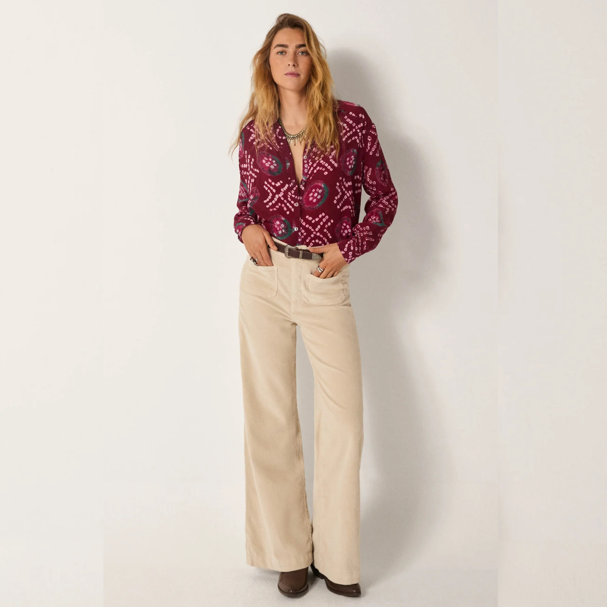 Sa texture épaisse et veloutée offre une expérience tactile évoquant les paysages accidentés et les nuits paisibles au coin du feu. Chaque détail est pensé avec soin, de la taille haute qui souligne la silhouette aux jambes évasées qui ajoutent une touche d'intensité à chaque pas.